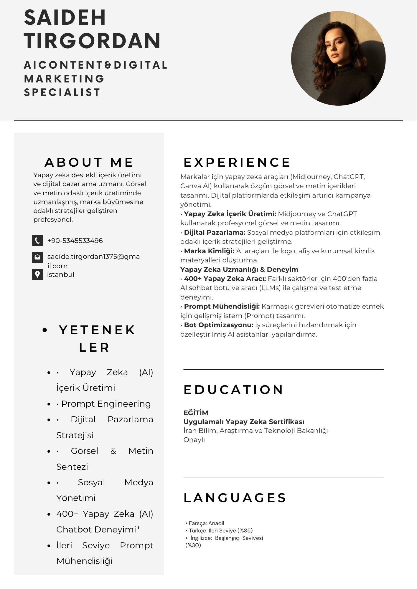 من سعیده تیرگردان هستم؛ استراتژیست و متخصص هوش مصنوعی. از ایدهپردازی و حل چالشهای مدیریتی تا تولید محتوای هوشمند و برندینگ شخصی، در تمام مسیر همراه شما هستم. Ben Saeide Tirgordan; AI stratejisti ve içerik uzmanıyım. Fikir geliştirmeden yönetim zorluklarına, akıllı içerik üretiminden kişisel markalaşmaya kadar yanınızdayım.
